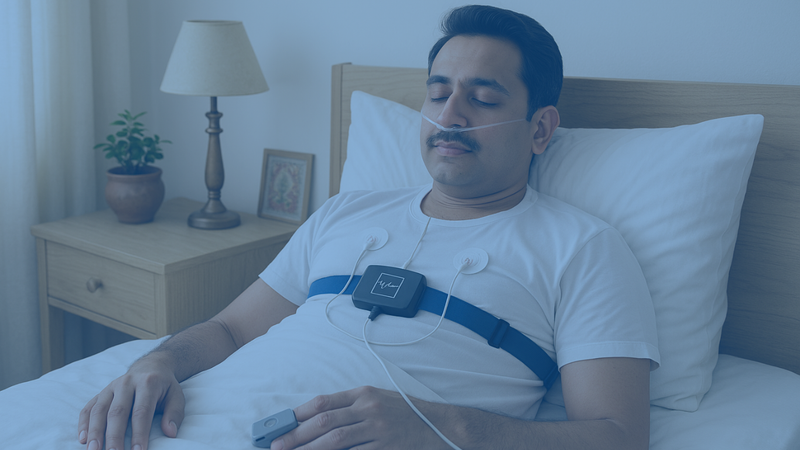 A convenient home sleep study that monitors your breathing patterns, oxygen levels, and sleep position in the comfort of your own bed. Available for Delhi-NCR residents with same-day device delivery and pickup services.